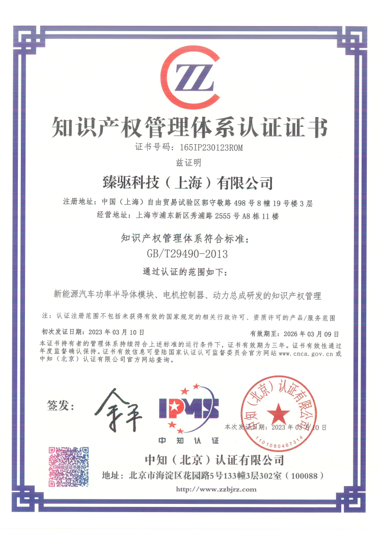 近日,從中知(北京)認證有限公司傳來喜訊,臻驅科技(上海)有限公司(以下簡稱“臻驅科技”)順利通過知識產權管理體系GB/T29490-2013認證,獲得《知識產權管理體系認證證書》,涉及新能源汽車功率半導體模塊、電機控制器、動力總成研發的知識產權管理。這標志著臻驅科技在知識產權規范化管理、知識產權運用、知識產權保護等方面的管理水平邁上新臺階。